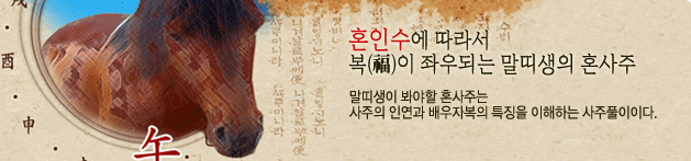 È¥Àμö¿¡ µû¶ó ±æÈäÀ» °®´Â ¸»¶ì»ýÀÌ ºÁ¾ßÇϴ ȥ»çÁÖ(È¥»çÁÖ)´Â ÁÖº¯¿¡¼­ °áÈ¥¿¡ ´ëÇÑ À̾߱⸦ ¸¹ÀÌ µè°Å³ª °áÈ¥ Àû·É±â°¡ Áö³µÀ½¿¡µµ ºÒ±¸Çϰí È¥ÀÎÀÌ ´Ê¾îÁö´Â »óȲ, ´ç½ÅÀÇ ¼º°ÝÀ» ¤¾î º½À¸·Î½á »çÁÖ¿¡¼­ ¤¾îÁö´Â ³ª¿¡°Ô ¸Â´Â °áÈ¥ Àû·É±â¸¦ »ì(ß°)Ç®À̸¦ ÅëÇÏ¿© ¿î¼¼ÀÇ È帧ÀÇ ÆÄ¾ÇÇÑµÚ È¥ÀÎÀû·É±â¿Í º»ÀÎÀÇ ¾ÖÁ¤¹× µ¥ÀÌÆ®ÀÇ ¼ºÇâÀ» ¤¾îº¾´Ï´Ù.